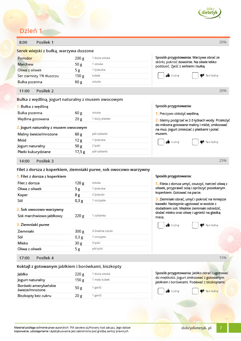 • w formie precyzyjnych jadłospisów wielodniowych (na każdy dzień miesiąca jest opracowany osobny jadłospis). Tutaj nie musisz zastanawiać się co zjeść każdego dnia, gdyż będziesz mieć dokładnie wszystko rozplanowane.