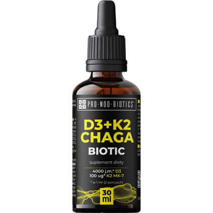Suplement diety w kroplach, z witaminami D3, K2 MK-7, ekstraktem chagi i siedmioma szczepami pożytecznych bakterii. Produkt rekomendowany dla osób dorosłych.